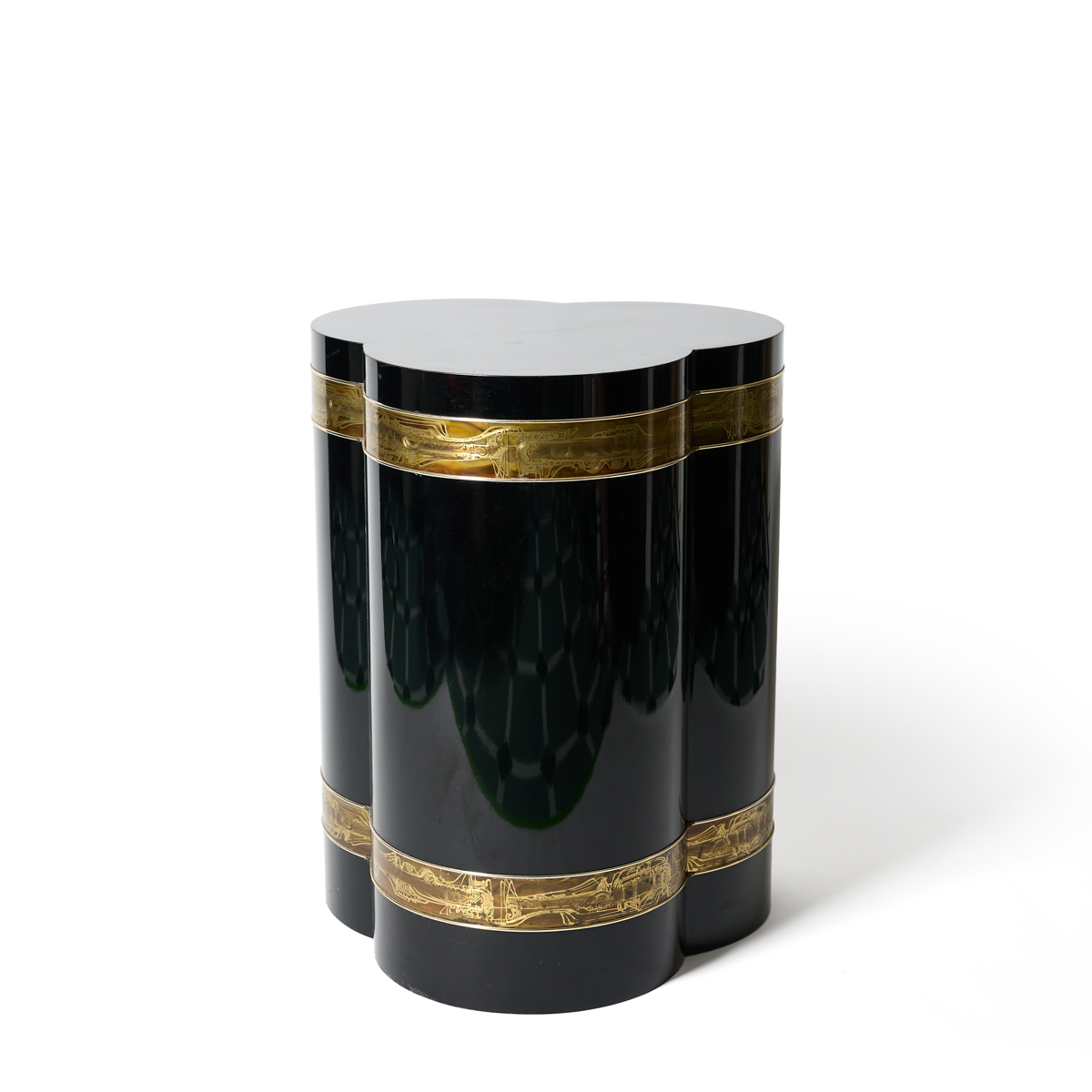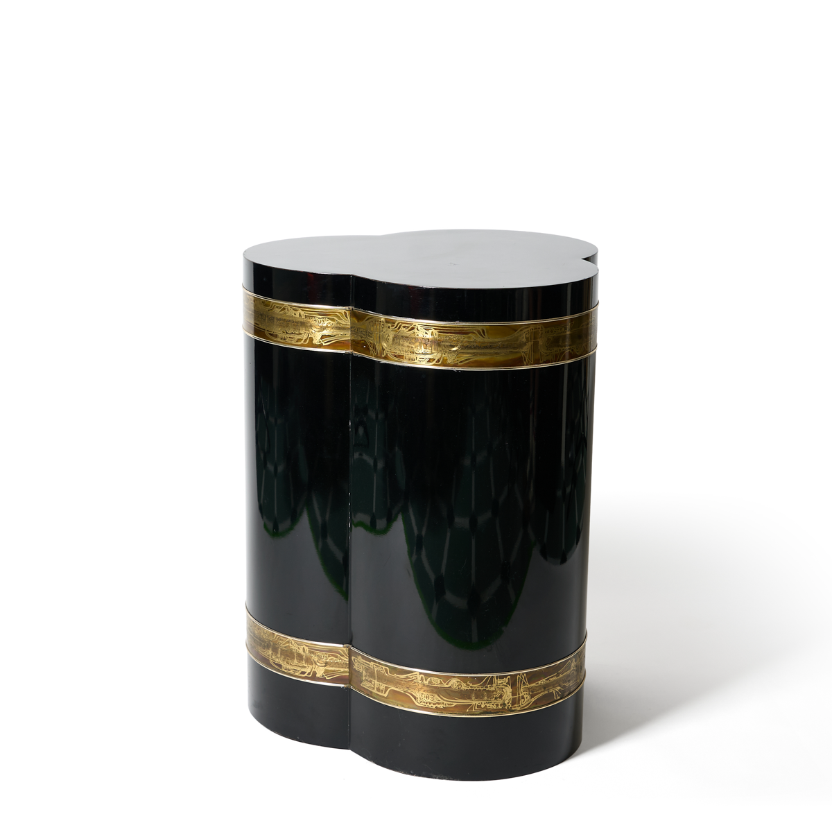 Bernhard Rohne for Mastercraft, circa 1970s. Pair of ebonized trefoil pedestal form side tables inlaid with bands of acid etched brass.