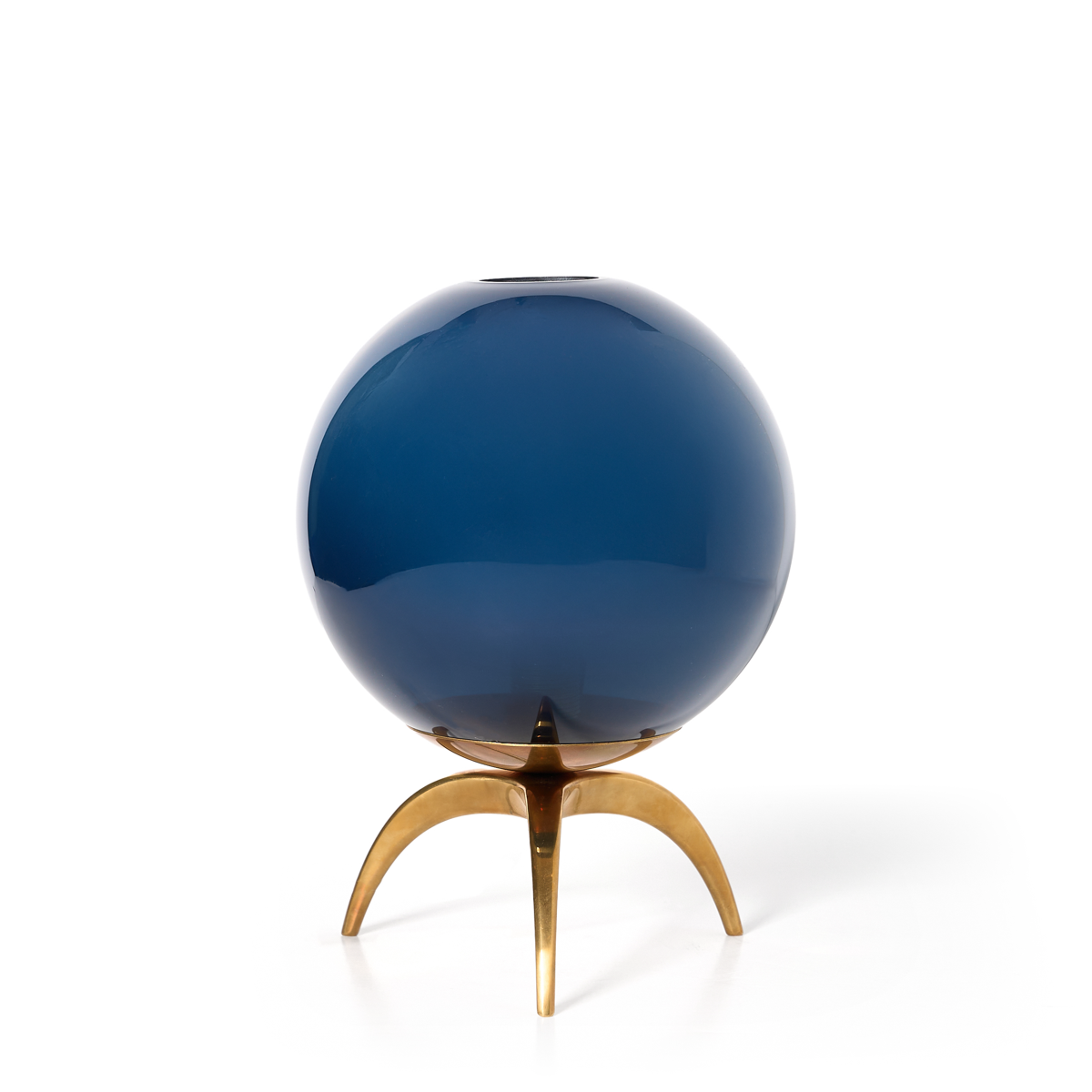 A chic Italian console lamp made for Found by maja. Each lamp has a blue globe that sits atop a brass tripod base.
