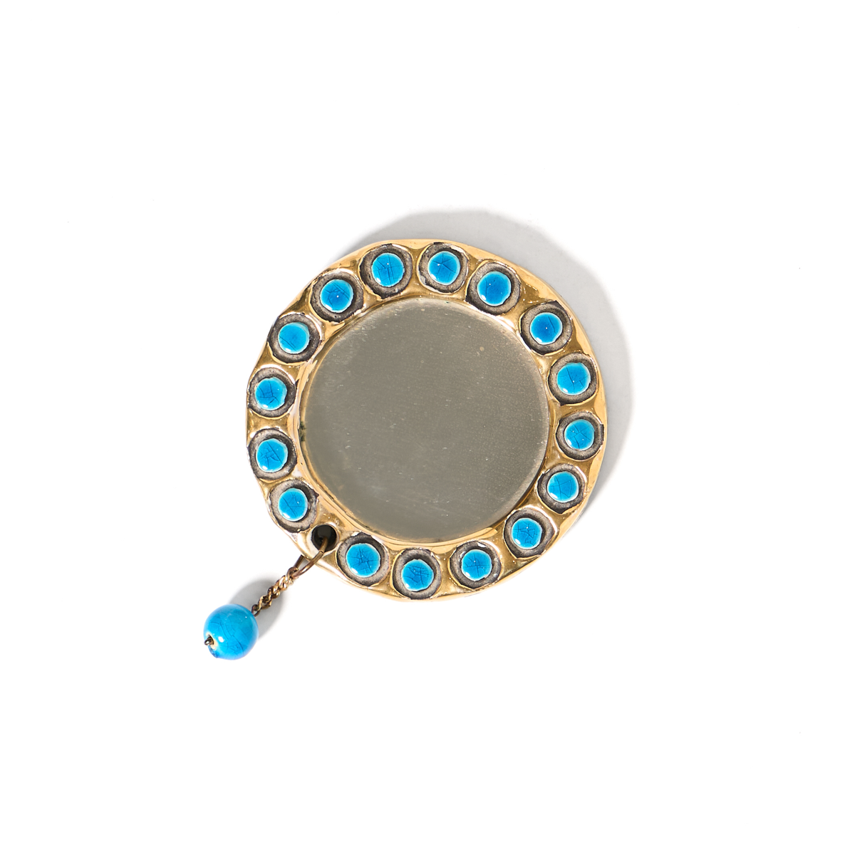 Glazed ceramic miroir de poche with crackled gold and precious blue ceramic adornments. The mirror was created by French ceramicist, Mithe Espelt to be place in your handbag in the 1960s and 1970s. This eye-catching mirror is perfect for your vanity.