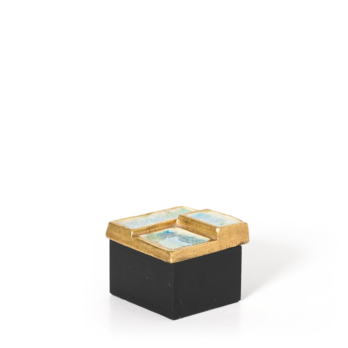 Black-painted wooden box with glazed ceramic top with crackled gold and precious green and clear ceramic stone adornments. The box was created by French ceramicist, Mithe Espelt in the 1960s and 1970s. This eye-catching box is perfect for your vanity.
