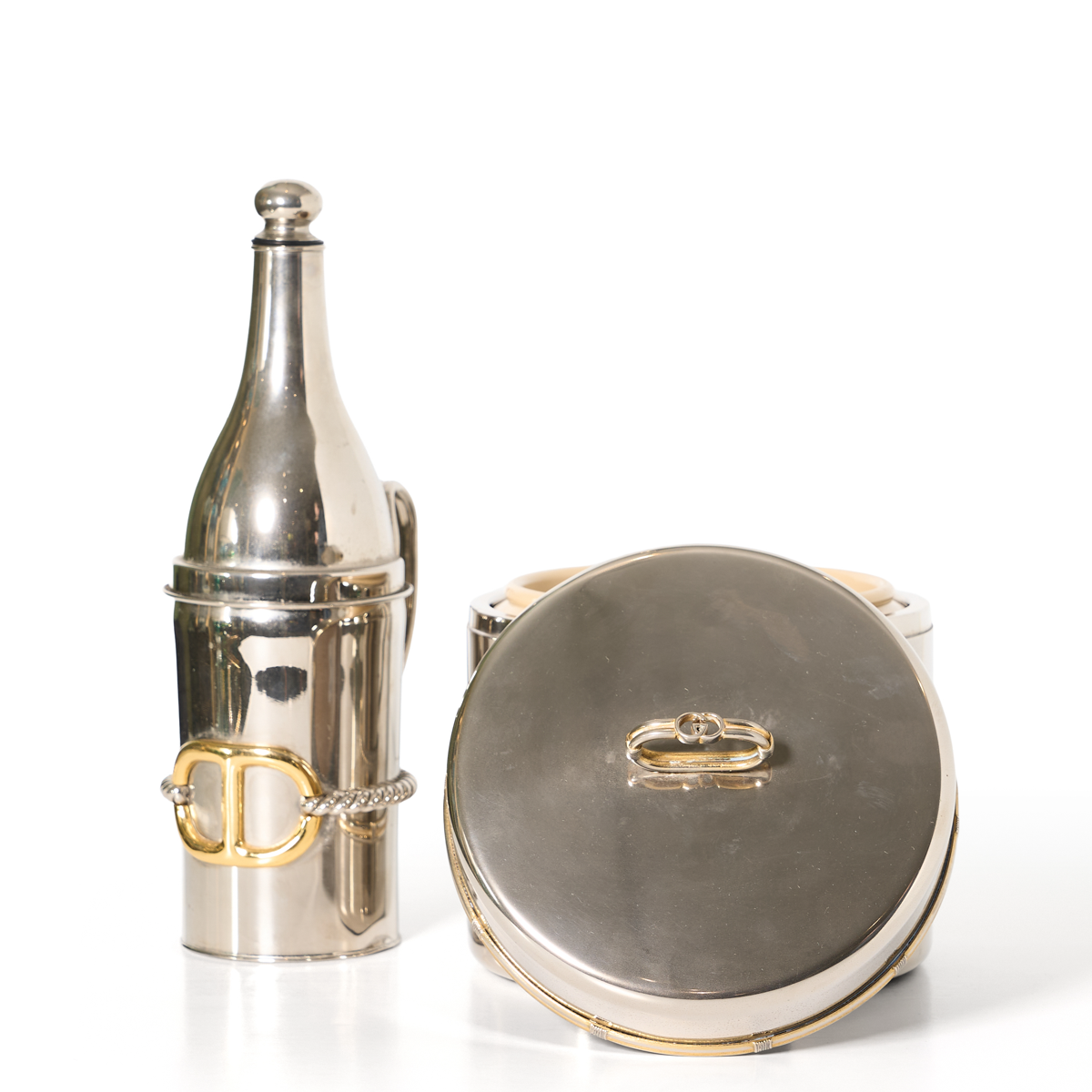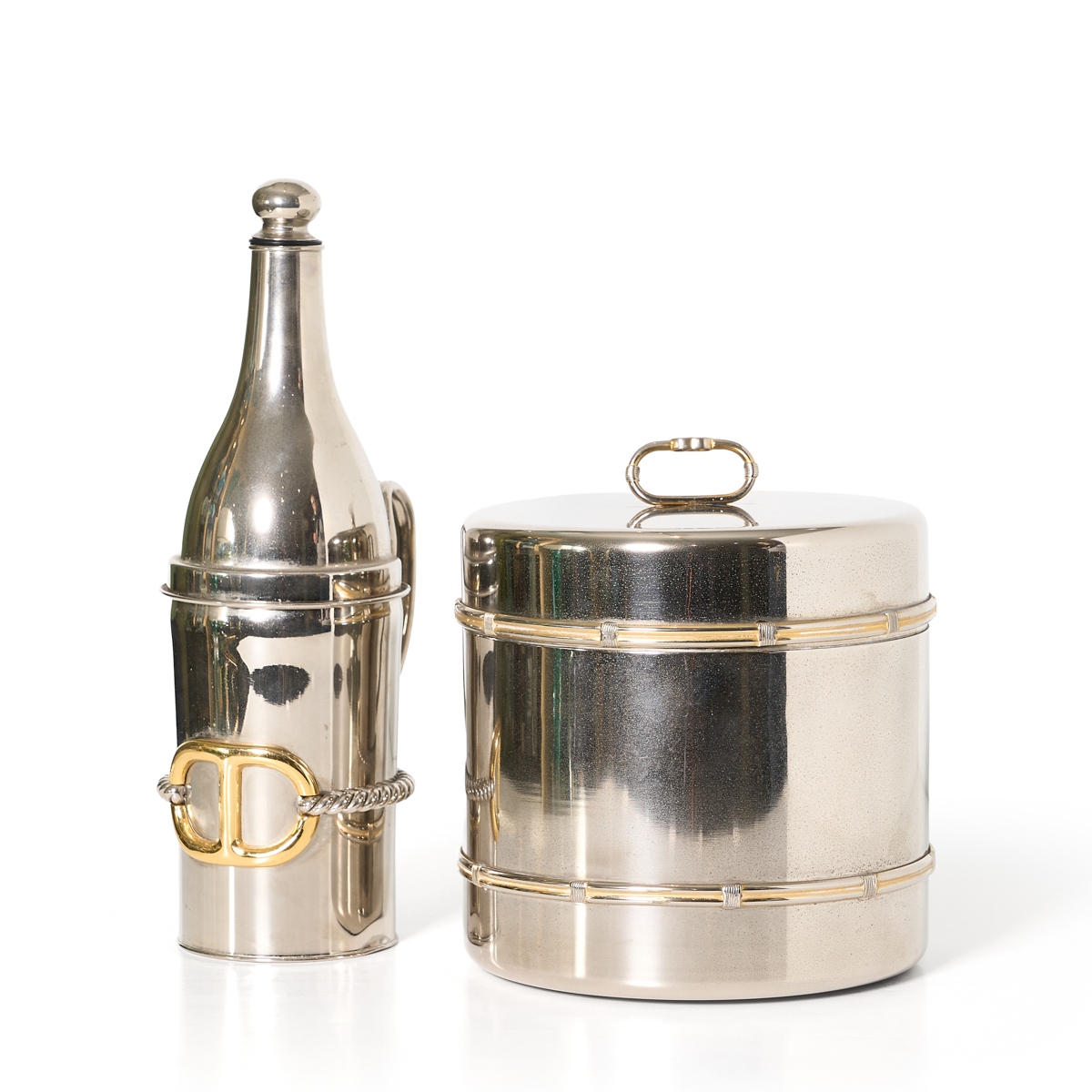 Gucci, Italy, crafted this luxury gold-plated and silvered metal barware bottle holder or bottle decanter and Ice Bucket circa 1980. These bar accessory features a sleek and modernist design made from silvered metal. They are adorned with details in 24K gold plated Gucci GG logo decor with a dimensional rope design. The bottler holder has its original metal and cork stopper. The company's legal hallmarks underside reads Gucci - Made in Italy.