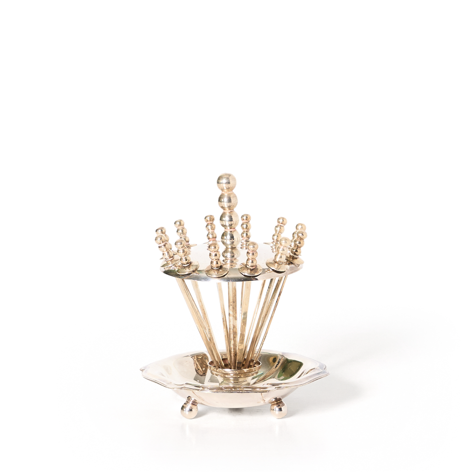 Add some whimsy to your home bar with these silver plate cocktail picks. Enhanced with a ornate design on the end of each pick.