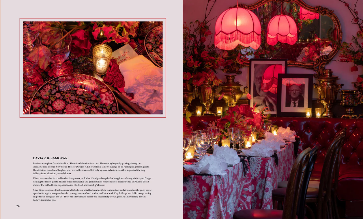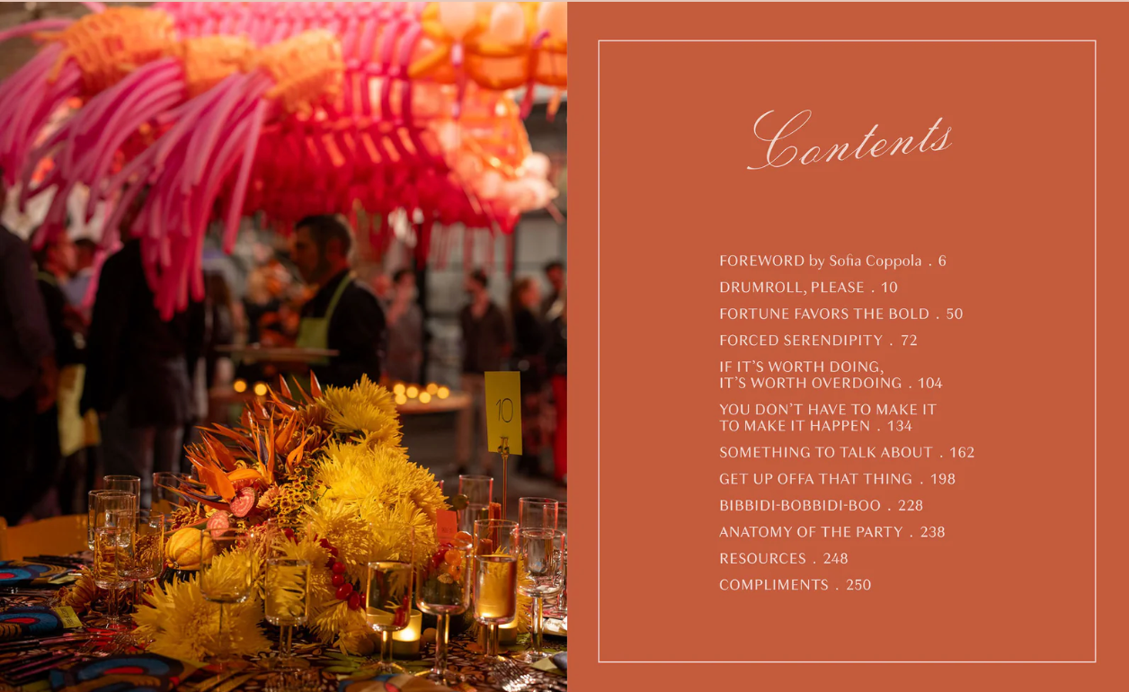 This book—like our parties—is a decadent feast for the eyes, with photography by Adam Kuehl that captures never-before-seen images that exude the surprise and delight of my hyperbolic entertaining style. From a brass band leading guests to dinner along the tracks of the Napa Wine Train to a pink-poodle-themed holiday party with a bountiful buffet of retro desserts, the pages burst with entertainments, heavy pours, and flattering light as all the elements combine in a perfectly orchestrated yet seemingly effortless way that makes it impossible for guests not to have a screaming blast!