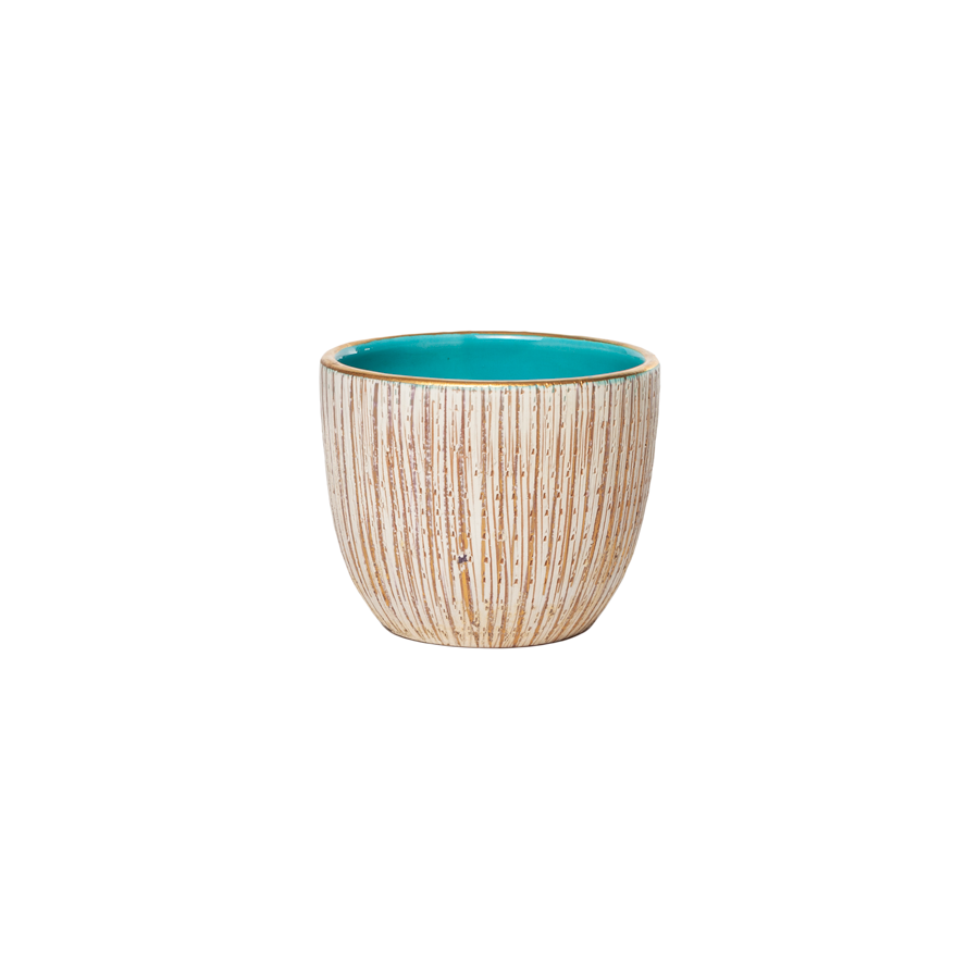 Aldo Londi Bitossi vase, ceramic white gold seta with a teal interior, Signed. Medium scaled compote from Aldo Londi's seta series. The rim is glazed with a simple band of gold and the body is glazed with textured gold vertical line atop green and blue horizontal stripes. Deep teal interior. Signed on underside: Italy 10-71