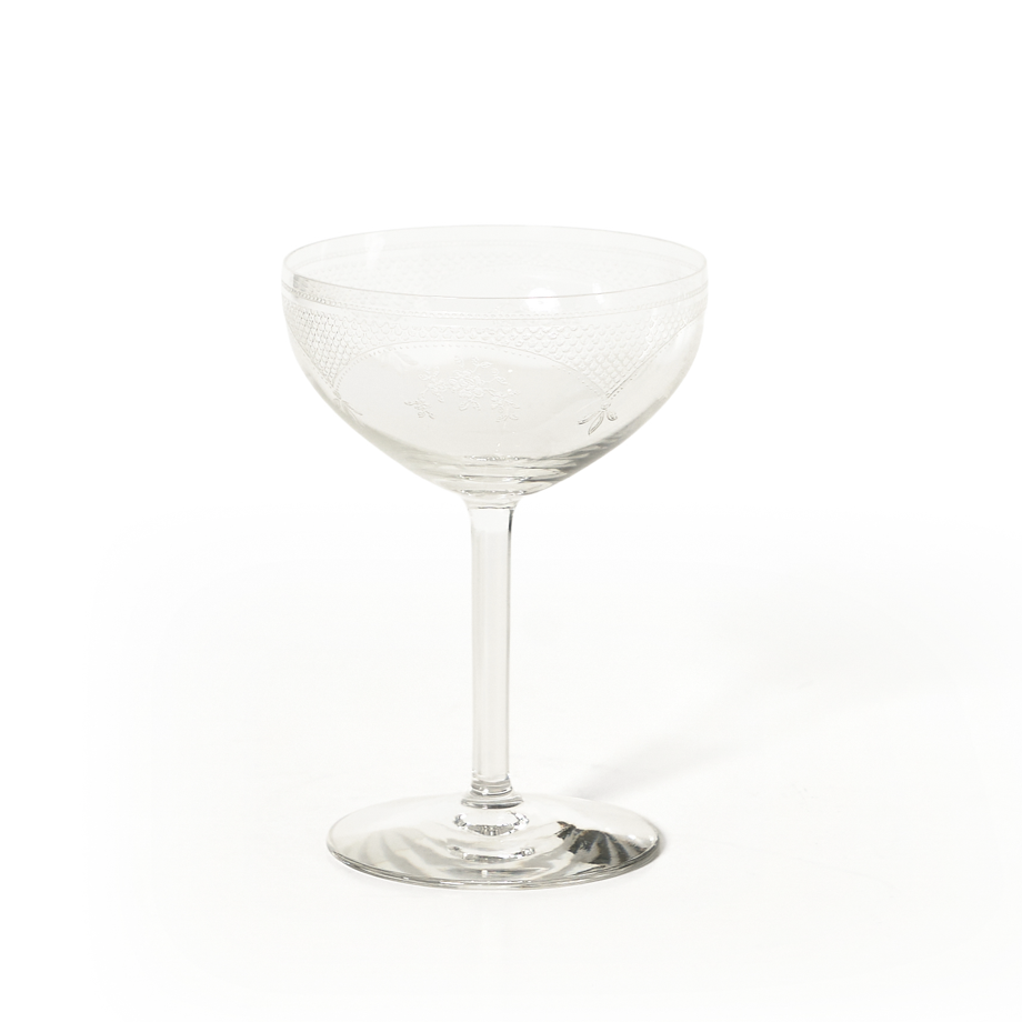 A wonderful set of 6 vintage champagne coupes adorned with etched lattice work.