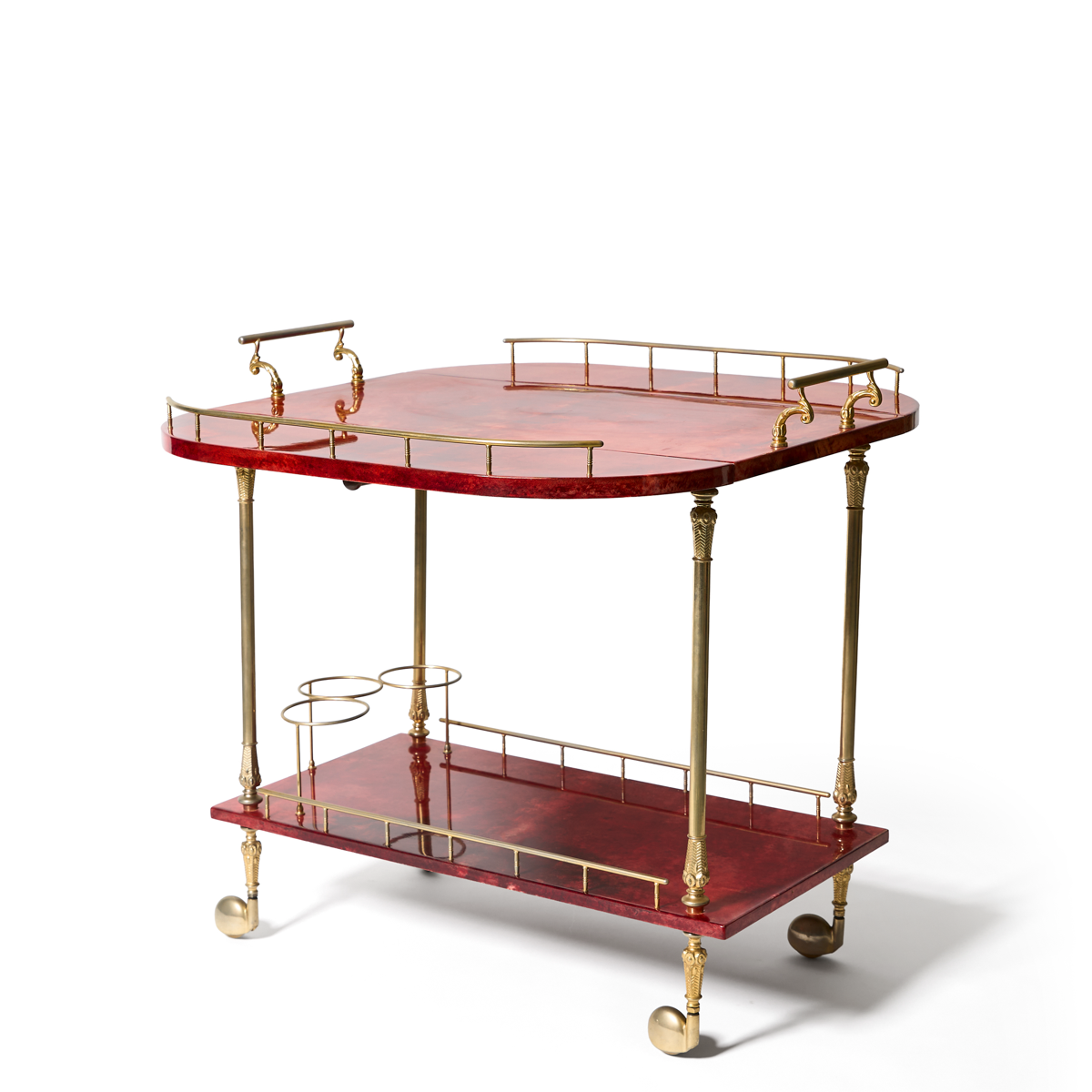 This vintage Aldo Tura hand-dyed and lacquered goatskin bar cart has incredible texture and depth of color, complemented by the highest quality hand cast brass hardware.