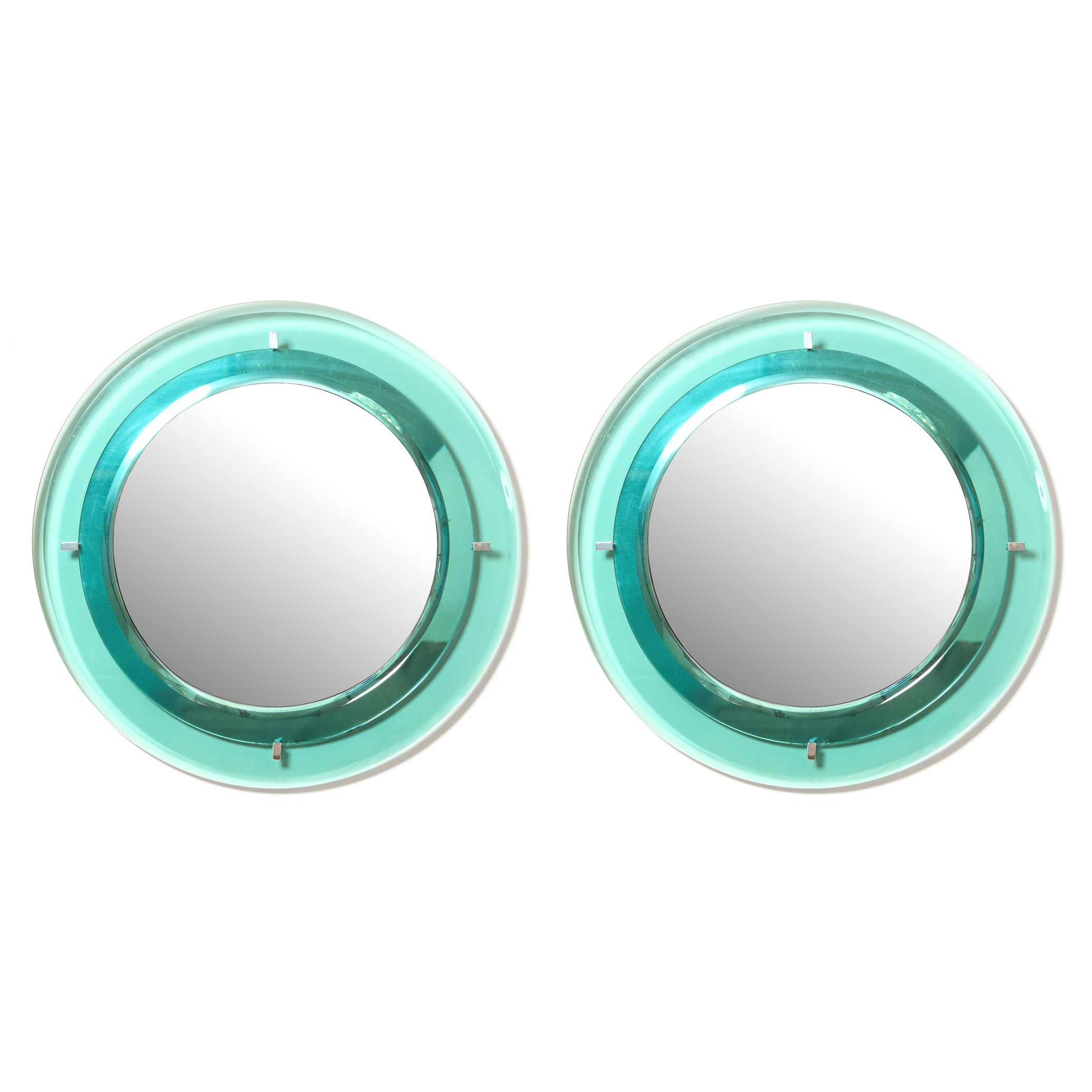 A 1960s Italian wall mirror attributed to Fontana Arte. The round central mirror is held within a pale aqua glass surround—subtly tinted, deeply beveled, and clipped with four chrome brackets that float it just off the surface. Light filters through the colored edge, creating a soft halo effect.